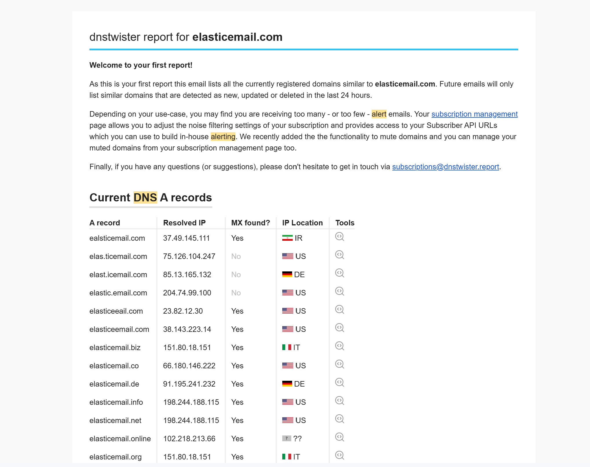 Domains with MX records can send and receive emails, making them prime targets for cybercriminals. DNSTwister alerts you if a new MX record appears or existing records change, highlighting potential threats before phishing emails reach your inbox.